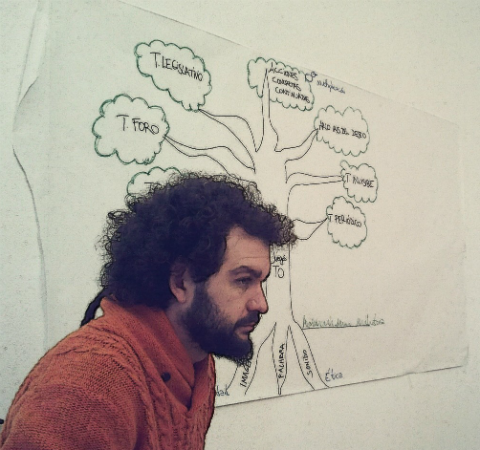 Antonio Masegosa sentado, detrás tiene la imagen del Árbol del Teatro del Oprimido