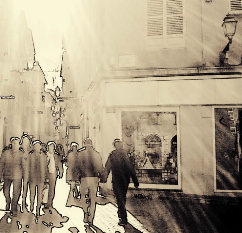Personas caminando por la calle, se cruzan sus caminos y se miran