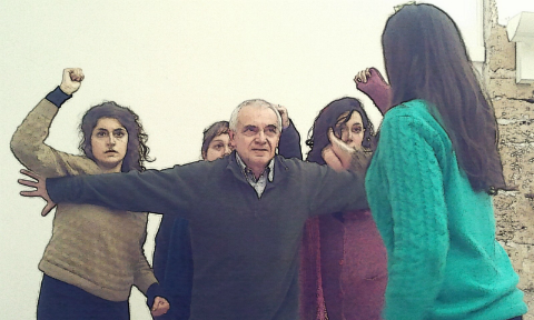 Escenificación del Teatro Imagen Tres mujeres juntas quieren avanzar hacia una cuarta mujer que tiene enfrente, y un hombre está en medio de ellas con los brazos extendidos